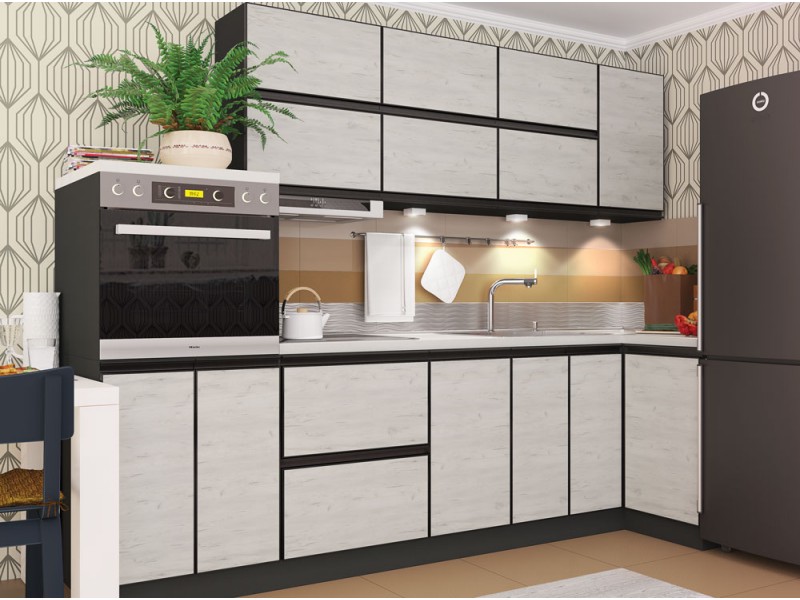 Корпус кухні виготовлений з ламінованого ДСП товщиною 16мм. Внутрішні полиці і задня стінка білого кольору. Можлива комплектація Стандарт чи Люкс (з доводчиками). Стільниці виробника Krono, товщиною 28мм і 38мм. Можна замовити будь-який розмір, кратний 10см, максимальна цільна довжина стільниці 3м або 4м.