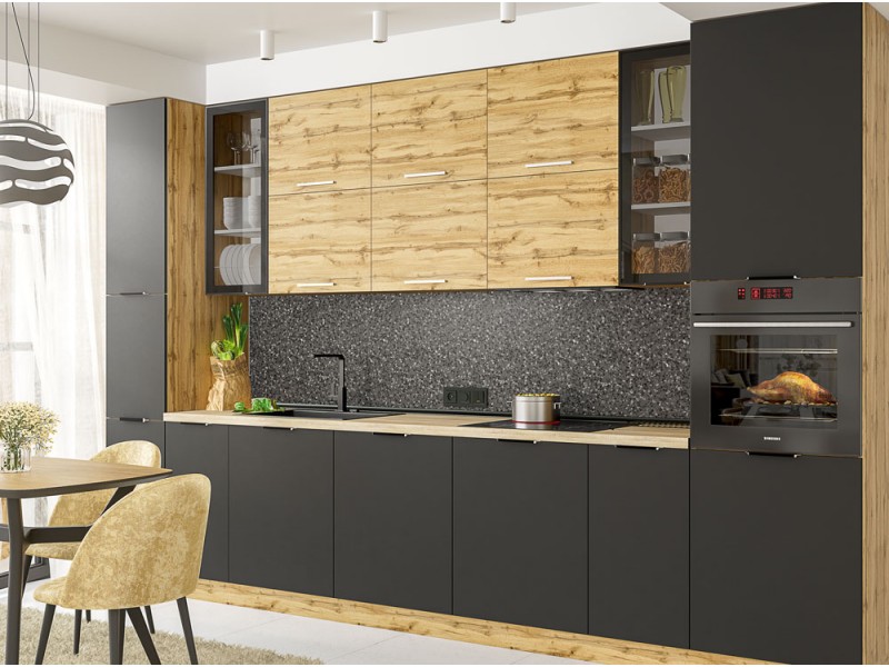 Корпус кухні виготовлений з ламінованого ДСП товщиною 16мм. Внутрішні полиці і задня стінка білого кольору. Можлива комплектація Стандарт чи Люкс (з доводчиками). Стільниці виробника Krono, товщиною 28мм і 38мм. Можна замовити будь-який розмір, кратний 10см, максимальна цільна довжина стільниці 3м або 4м.