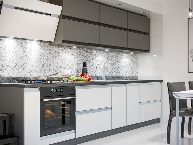Кухня "GaMa" — модульна посекційна кухня, яку можна підібрати на будь-який розмір. Фасади виконані з плити ДСП завтовшки 16 мм та доповнені алюмінієвою ручкою-профілем, яка монтується на всю ширину модуля, що робить відкривання особливо зручним. Ручка має два кольори – алюміній AL та чорний BL. Якщо ви шукаєте бюджетну кухню, яка має гарний вигляд і зручна у використанні, то найкращий варіант – ламіноване ДСП.