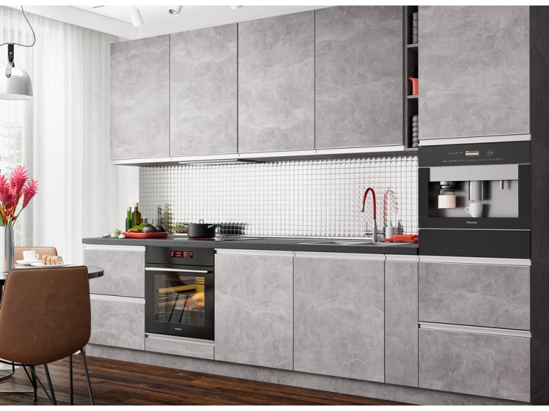 Фасады кухни "Альбина" изготовлены из ДСП толщиной 16 мм и дополнены алюминиевой ручкой-профилем. Фасады кухни "Альбина" доступны в девяти тонах: Белый, Слоновая кость, Антрацит, Сосна Натти, Дуб сонома, Трюфель, Венге, Дуб аппалачи, Бетон. Витрины в этих кухнях не предусмотрены. Можем изготовить фасады под индивидуальный размер.