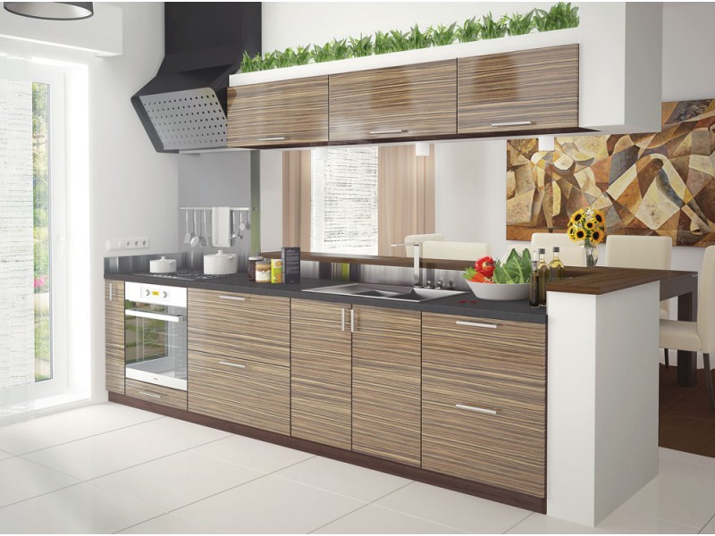 Корпус кухни изготовлен из ламинированного ДСП толщиной 16мм. Внутренние полки и задняя стенка белого цвета. Возможна комплектация Стандарт или Люкс (с доводчиками). Столешницы производителя Krono, толщиной 28мм и 38мм. Можно заказать любой размер, кратный 10см, максимальная цельная длина столешницы 3м или 4м.