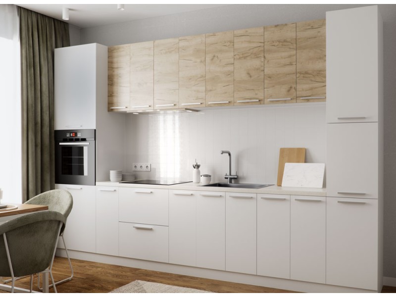 Корпус кухни изготовлен из ламинированного ДСП толщиной 16мм. Внутренние полки и задняя стенка белого цвета. Возможна комплектация Стандарт или Люкс (с доводчиками). Столешницы производителя Krono, толщиной 28мм и 38мм. Можно заказать любой размер, кратный 10см, максимальная цельная длина столешницы 3м или 4м.