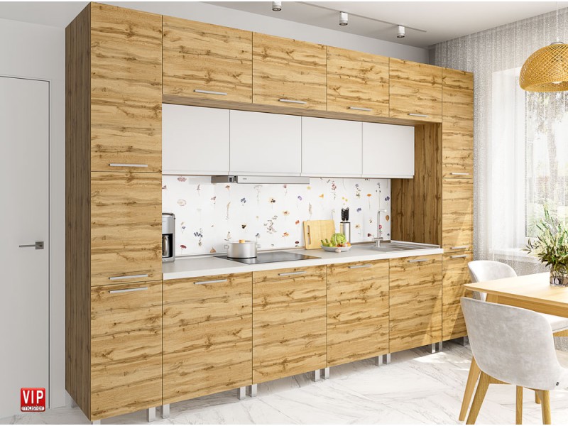 Корпус кухни изготовлен из ламинированного ДСП толщиной 16мм. Внутренние полки и задняя стенка белого цвета. Возможна комплектация Стандарт или Люкс (с доводчиками). Столешницы производителя Krono, толщиной 28мм и 38мм. Можно заказать любой размер, кратный 10см, максимальная цельная длина столешницы 3м или 4м.